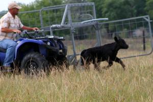 The calf catcher is all-welded, durably constructed steel cage that mounts with ball hitches on the front and back. It works well in all types of terrains and conditions. With the front gate locked open, the driver approaches the calf and captures it in the cage by shutting the spring-loaded gate. The producer enters the pen through the open side by stepping from the ATV or UTV and moves the calf to the rear holding area where he can tag, vaccinate, weigh and even band the babies while protected from the mother cow. When finished the producer releases the calf out the back to its mother.