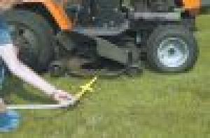 After mowing and parked on a flat surface, turn off the mower engine, connect the Empire mower deck washer to a common garden hose and place it under the raised mower deck, then engage and run the mower blades at high speed. The mower’s engine power of the spinning blades greatly increases the water’s velocity. After only a few minutes, the underside of the mower deck will look like it was power washed. A clean mower deck cuts much better than one clogged with dried grass clippings.