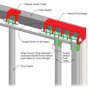 The wrap-around hinge brackets connect directly to the vertical push tubes for added strength Schweiss doorframes are designed with double push tubes that are tied directly into the wrap-around hinges that connect both vertical push tubes directly to the header tube The advantage of double push tubes is that forces of the hydraulic cylinders are evenly distributed to the doorframe and hinges