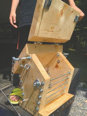 With a chain running through eyebolts, the feeder was hung this fall on a 6 by 6 beam used for a swing during the summer. In the past, bears destroyed feeders during the fall in their search for food before hibernation.