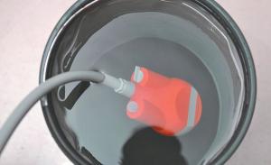 A waterproof pump sets in a 5-gal. bucket of warm water. Turn the unit on, and water flows through a hose to a hand-held shower head.