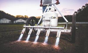 “The Pyroweeder is designed to straddle a 30-in. bed,” Dysinger says. With an offset and reversible handle, the operator walks in a path next to the row to avoid compacting the soil bed. The size of the unit makes it easy for customers to push. Typically the Pyroweeder is used by gardeners with 1 to 5 acres.