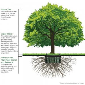 “Our new underground reservoir system for trees provides direct deep root watering on demand, with almost no evaporation. It provides long term protection, especially in times of drought,” says Randall Paige, Sr., in describing his new underground plant root basket and reservoir.