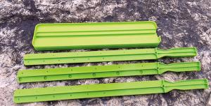Made from UV-hardened ABS plastic, the system consists of a 15-in. long, 4-in. wide seed tray with a channel running down the center and a set of three 18-in. long, 1 1/2-in. wide paddles that fit flat into the channel in the seed tray. The paddles each have series of evenly spaced holes on both sides.