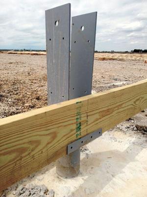 Each Strong Way Column comes pre-assembled and with pre-drilled holes that make for simple attachment. “The steel column is much lighter than wood posts, which makes it easier to lift and also reduces the need for heavy machinery to assist in transportation and installation,” says Beach. “Each post can be adjusted without difficulty and with precision while upright, which eliminates the need to correct post lengths on site.”