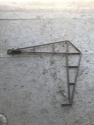 The arch is made out of 1 3/4-in. steel tubing for uprights with 1-in. steel tubing for the angled top. The multi-tine flake retainers are row closers salvaged from an old Buffalo corn planter. The bale hook is a simple right angle device reinforced with roof-truss like supports, all fabricated from steel rod.