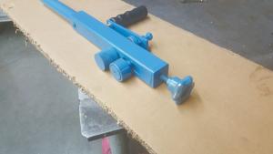 The roller consists of a 1-in. sq. steel tube with 2 steel rollers. One mounts on a shaft with a Thomson bearing. The shaft extends through the steel tube to a hand crank. A second roller (just above the first) is mounted on a bearing through a slot in the side of the steel tube. Inside the tube, it is fastened to a steel block at the end of a threaded rod. The rod extends through another threaded steel block welded to the end of the tube and is topped by a knob.