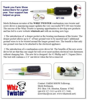 Contact: FARM SHOW Followup, Merle Robinson, P.O. Box 538, Hesston, Kansas 67062 (ph 620 327-5115 or 620 327-7440; mwrwhiz@cox.net; www.whiztools.net).