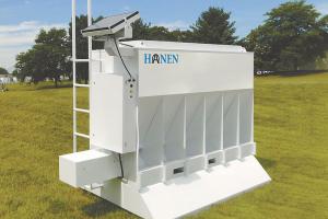 An attached battery is recharged by a solar panel, making the programmable feeder fully portable. It’s designed to be picked up and moved by a tractor with forks. Once in place, it can be programmed to deliver desired amounts of feed up to 6 times per day.