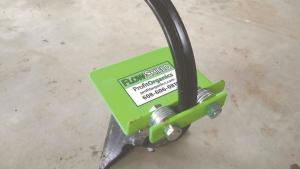 Flow-Shields mount on the front side of the cultivator shank directly over the shovel. Height can easily be adjusted to deliver a steady stream of crushed soil into the row at a consistent height on the lower portion of the bean and corn plants.