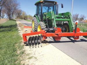 The reclaimer is designed for loader tractors with at least 65 hp., but can also be 3-pt. mounted. It consists of a 5-in. square toolbar with a short hinged frame at one end supporting several big coulters. The coulters pull material back up to the edges of the road, with a hydraulic cylinder used to change their angle. Four 100-lb. counterweights are mounted at the other end of the toolbar.