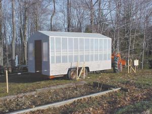“I cut down an old door to the proper size and added a fold-down step made from scrap steel that I hinged to the trailer,” he says. The greenhouse is covered by 6-mil plastic.