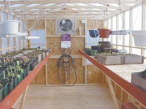 The 16 by 8-ft. unit is outfitted with all the modern conveniences, including water and electrical hook ups. It makes it easy for him to start the hundreds of plants (300 tomato plants alone) that he later transplants to his three gardens or gives away to neighbors.