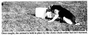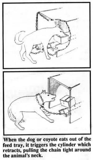 The trap consists of a long spring-loaded cylinder that's anchored to the ground with two screw-type anchors. The piston on the cylinder connects to a chain' fitted with a choke collar. A garbage can-type cover goes over the trap. A feed dish, which triggers the trap, mounts on top of the cylinder.