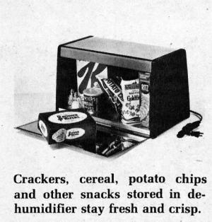 The unit also keeps salt shakers flowing and prevents sugar from turning to stone. It's designed for the high humidity of most kitchens and uses a minimum electricity to keep contents slightly warm and crunchy. Measures 18 in, long, 11 in. wide and 11 in. high. The body and door are chrome-plated steel; end caps are made of high-impact plastic. Approved by Underwriters' Laboratories.