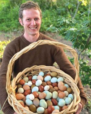 Duval has been raising chickens since she was a young girl, living on less than an acre with her family near Santa Cruz, Calif. It wasn’t until she and Ryan married and began looking for a small farm that they learned how most hatcheries dispose of male chicks. The idea of live chicks being ground up and used in chicken rations or incinerated convinced Duval to hatch out her own. In the past 7 years her passion has become their business. Today they keep around 250 adult birds, all carefully selected for egg color, productivity, beauty, and temperament.