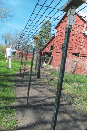 The horizontal panels are wired to the top of the existing fence and supported by short wooden blocks, which Gogerty wired to the top of each post. He plants seeds next to the existing panel fence.