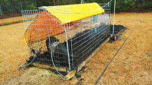 The 4 by 10-ft. portable pen is built with pressure-treated wood and heavy-duty livestock panels, and includes a PVC waterer that holds 7 gal. of water. It’s covered with a sturdy 8-oz. tarp.