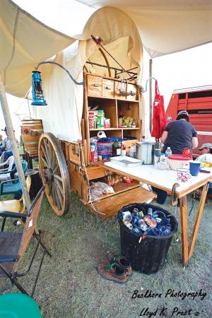 “I bought 1-in. red oak boards to build the chuck box that sits at the rear of the wagon,” says Thompson. “It has an upper unit with shelves and drawers. The back door is hinged to lay down for use as a worktable. The lower box is where my Dutch ovens sit, and I have water barrels on either side.”