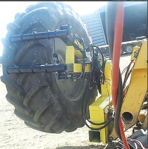Tire Wrangler Handles Big Tires and Wheels  TIRES/WHEELS Handling Handling big farm wheels and tires up to 90-in  dia  is safe and easy with the Tire Wrangler built by a North Dakota company  Owner Bruce Pigeon says the Tire Wrangler works in conjunction with his patented Agra Jack to provide an extremely safe method for changing wheels and tires    The Tire Wrangler comes ready to be mounted on a skid steer and can also be adapted to loaders and forklifts  He recommends using a skid steer rated between 2 500 and 3 000 lbs  at the head plate  His original model has a 12-volt powered rotator and a second model can be rotated manually  Pigeon says the Tire Wrangler handles sprayer  tractor or combine tires  and even larger floater tires that weigh 2 000 lbs or more  “The rotator head has 4 hydraulically-operated clamping arms attached to a strong vertical column on the main frame  When those arms are closed securely they’ll hold large tires in any position ” says Pigeon  The rotating head moves the arms left or right to clear fenders and other obstacles  Hydraulic cylinders open and close the clamps to securely grab and hold large tires and wheels  which can be lifted  inverted  laid down  picked up or stacked from the safety of the operator seat  The hydraulic controls are sensitive and deliberate  so wheels can be easily be aligned on the studs and bolts     Pigeon says he came up with the Tire Wrangler design after seeing a large clamping machine move stacked cardboard  “The light came on instantly  so I went back to the shop and drew up plans  I built a prototype  modified it somewhat after testing  and now we have two models ” Prices start around  $4 400  Contact the company for current pricing  The Tire Wrangler is an ideal complement to the Agra Jack™  another product that Pigeon designed  patented and builds for lifting heavy equipment  “I built that product as an answer to a near tragedy after helping the owner of a new high boy sprayer re-install a partially removed tire  The cribbing he used had partially collapsed  and the wheel was holding on just 3 bolts  As we managed to get the sprayer lifted and the wheel back on  he asked me to build a better jack so he wouldn’t kill himself  That product is now the Agra Jack™ ” The Tire Wrangler is the second part of the system  Says Pigeon  “I engineered both products for safety  and we don’t take any shortcuts in manufacturing  Every device is built  assembled and tested in our facility ” Contact: FARM SHOW Followup  Agra-Jack  341 Railroad Street  Garrison  N  Dak  58540  ph 701 463-2959; bwpigeon@restel com; www agrajack com