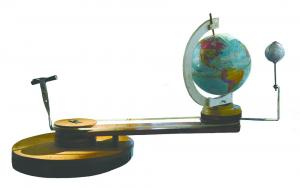The earth is represented by a globe, the moon by a golf ball wrapped in foil, and the sun’s rays are provided by a flashlight at the opposite end of the model. He manually spins the contraption, showing how angles and light change in winter and summer.