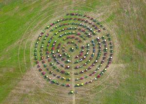The Tri-State Old Iron Association in South Dakota has held an annual 2-day tractor ride since 2006. In 2010, members Jerome and Beverly Mueller started creating different designs on paper and then translated those designs into hundreds of tractors lined up in a field to create images photographed from the air.