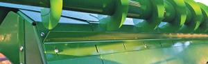 The auger works efficiently because of a patented stripper bar that helps direct crop from the header to the auger for quicker feeding. Center paddles on the Cross Auger are mounted at a 45-degree angle to help efficiently push material away from the auger and into the center drum fingers. The design helps eliminate shattering and reduces the possibility of crop stems wrapping on the auger.