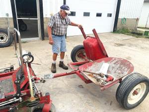 Hernke removed the front wheels from the tubs but left the handles in place. He fastened the tubs to the cart frame using piano hinges so material could be easily dumped out. The cart has a sturdy axle and two old wagon wheels in front. He attaches it to his 37 hp. Husky zero-turn mower with a ball hitch.