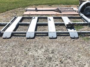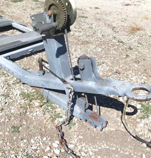 A pintle hitch pivots on the 4 by 4-in. tubing that extends out from the frame. When the trailer is in the raised position, the pintle hitch is pinned in place. In the lowered position, it is unpinned.