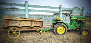 Mini Wagons Perfect For Garden Tractors FARM HOME recreation After you’ve restored a couple of garden tractors the best way to justify owning them is to make wagons to go with them At least that’s what Tony Voigt decided and the mini wagons he started building have proven popular with young visitors to his Fox Lake Wis property Instead of building his first wagon’s running gear from scratch Voigt started with a new wagon-style Gorilla cart rated for 1 500 lbs He removed the metal sides and sanded off the black paint to repaint the frame in John Deere green and yellow Using the existing holes on the trailer he bolted on walls he built out of 1 by 6-in boards He stained the wood and added chains across the door openings to make it resemble a hay bale wagon “I cut railroad ties and covered them with mini-golf carpet to make them look like mini hay bales ” Voigt says The wagon can haul up to five young children when pulled by his dad’s 1972 John Deere 110 square fender garden tractor For his second wagon Voigt used steel wheels he had purchased at an auction for $35 “The hardest part was building the axle I experimented with pipe and made my own bushings and bearings ” he says Scrap wood from a deconstructed farm building was perfect for the walls and wooden tongue to create the look of an old barge wagon After cleaning the wheels with a steel brush he painted the wagon to match Voigt’s 1967 John Deere 110 round fender tractor used to pull it With bench seats it’s perfect for giving two or three young children a ride When not being used the wagons double as yard ornaments Contact: FARM SHOW Followup Tony Voigt W9736 State Rd 68 Fox Lake Wis 53933 foxrunfarms02@gmail com