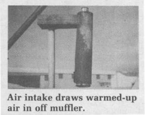 Plenis put a piece of 5-in. dia. stovepipe around his 4-in. dia. muffler. He put a cap over the end of the exhaust pipe, with a 2-in. dia. hole cut in the center for the exhaust pipe. He then ran a 4-in. duct from the top of the stove pipe over to the engine air intake pipe, plugging the end of the duct in winter so the engine is forced to draw in warmed-up air from around the muffler.