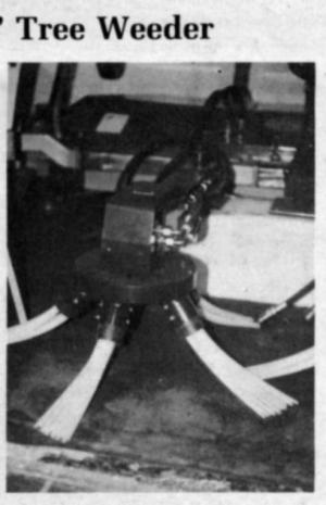 The manufacturer, Pobalti, in Bellpuig, says the brush-weeder was developed to replace steel tined weeder arms. The plastic brushes are made up of strands ?-in. in dia. that spin at 300 rpm's powered by a hydraulic motor. The brush mounts on a retractable arm that lifts around trees, when necessary.