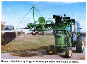 He mounted an old pitmanless sickle mower in a fork-type rock picker attachment that mounts on a front-end loader. The mower is belt-driven by a Briggs & Stratton gas engine that also mounts on the rock fork. The sickle can be operated in either the vertical or horizontal position.