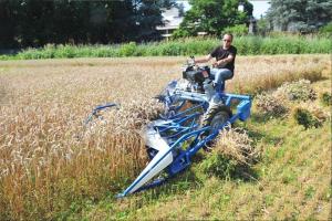 The 622 has a working width of 55 in. and weighs just over 1,000 lbs. when equipped with the sulky seat. It’s used to cut and bind small grains, rice, sesame, lavender, reeds and more from 14 to 63 in. in height. The design allows crops well over 30 in. tall to flow under the deck, with sheaves tied off at a height of 11 in. The diameter of the sheaf can be adjusted.