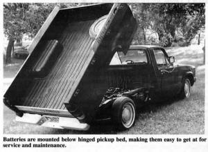 The truck is equipped with 20 Trojan 6-volt deep-cycle marine-type batteries wired in series. They weigh 71 lbs. apiece. Dozier hinged the bed of the truck and mounted the batteries below on a platform made from angle iron and steel plate. (Dozier beefed up the rear suspension with two extra leaf springs to handle the load.) The batteries drive a 9- in. dia., 18 in. long D.C. brush-type electric motor, which will operate in a 72 to 140-volt range. The motor mounts in the engine compartment along with two of the 6-volt batteries. The pickup's 12-volt battery remains in place in the engine compartment to power accessories and electric motor controls on the dashboard.