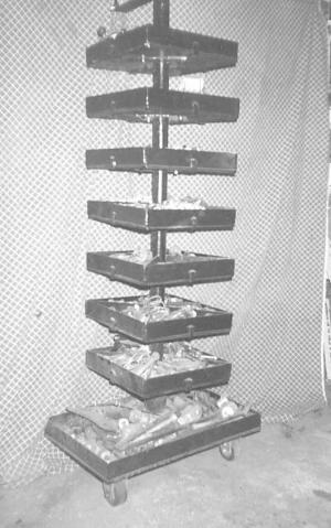 Rotating Tool Tray FARM SHOP Tools 19-6-30 Denis Desjardins, Alcove, Quebec: "I built this rotating tool tray out of a Pontiac car rear end. I used 1/8-in. thick scrap metal to make seven 14-in. sq. trays and welded them to the axle. I used 5/16-in. thick steel plate to make a larger bottom tray that bolts to the axle hub's five studs so that the axle housing and seven trays turn freely. I put a bracket at the top that screws to the wall to hold the entire unit stable. If I need to roll the trays to a different place in my shop I just push up on the bracket to release it.