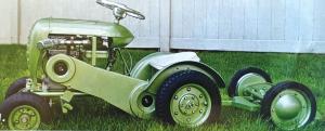 Mini-Mower Built For Custom Tractor MOWERS Shortly after designing and building a one-of-a-kind custom mini-tractor Matt Castagno decided that the shiny little gem needed an attachment Castagno says he originally thought about a belly mower but that idea morphed into a pull-behind reel mower Castagno searched several online sale and auction sites for a mower that he could modify and rebuild in a smaller size to match his tractor That search turned up reels from golf course mowers power reels gang reels and manual push reel mowers but none seemed to fit his needs Eventually he bought an old Craftsman push mower as a parts donor from a New Hampshire collector Shipping it to him cost more than the actual mower but that didn’t deter him To scale the mower for his tractor Castagno needed to reduce its width by 4 in He disassembled the old Craftsman removing the hubs wheels drive mechanism cutting bar reel and roller He says cutting and shortening the hardened steel reel shaft and knife bar ruined several bandsaw blades Eventually he got the parts sized to the proper length He removed the mower’s original push handle and fabricated a new hitch from sheet metal and tube steel It hooks directly to his tractor and looks “factory made ” Castagno says the original wheels and gear drive mechanism were in good shape and just needed a thorough cleaning to function well To complete the project he painted all the mower parts to match the tractor patina and reassembled it with the new hitch He says the mower and tractor are now museum-quality pieces and won’t be used for actual work Completing this project was so successful Castagno says that he plans to build another tractor that he can use for work get dirty and then get it cleaned up to drive in parades Contact: FARM SHOW Followup Matt Castagno grnlark@cox net