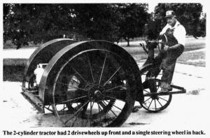 Farmers paid $350 for the Ford tractor in 1909. It had 8 drawbar horsepower and 16 hp. on the belt. The 3-wheeled, 2-cyl. tractor had two drivewheels up front and'a single steering wheel in back. It was started with a crank inserted between the spokes of the left front wheel. Larsen says one of the tractor's problems was that the rear end skidded around, especially when pulling equipment, making it difficult to steer. Another problem was that all the transmission gears were right in the open, making them difficult to keep free of dirt. Some farmers complained that the tractor broke down before they could even get them home.