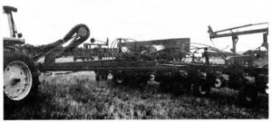 "It really folds slick. The tongue is built in two sections, with one section sliding inside the other when the planter is folded out for field position. The tongue is 16 ft. long in field position and 32 ft. long in road transport position. The planter has eight lift assist wheels - four on the center section and two on each wing. Each lift assist wheel is equipped with a hydraulic cylinder. An automatic leveling device allows each wing to float up and down independently."