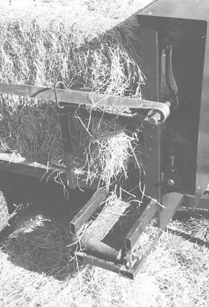 You tilt the feeder deck down to the ground and run a length of belt behind the bale, then winch it up onto the deck. The belt continues to pull the bale forward as it wraps around the ground-driven shaft up front that slices hay off the bale. Hay falls onto the small rubber conveyor that drops hay out the side. "When you're done feeding bales you can use the self-loading trailer for other jobs," says Stewart.