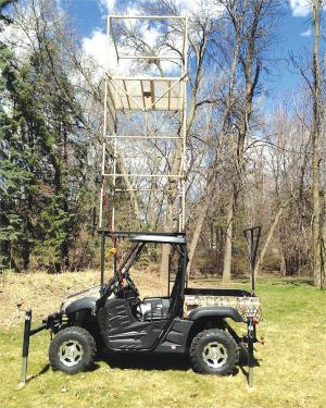 The structure is a metal cage with 3-ft. extensions. It attaches to any ATV or can be mounted on a UTV or pickup truck using an optional bracket assembly. The unit features a boat seat mount and hand crank winch that lifts it from 11 to 14 ft. in height.