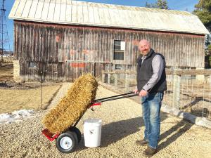 Larry Kuhl’s Happy Hawler makes carrying a 5-gal. bucket of water easy, with no water sloshing on pants legs. The two-wheeler, with extra-long handles, reduces the load by 75 percent. Brackets are designed to snatch up a bucket or bale or carry a muck bucket. Slip on the dolly base plate and carry a bale in front and a bucket to the rear.