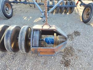 Peters imagined a puller that applied pressure to both the packer wheel and the weld on the center pipe might work, so he designed the pieces for an open-to-the-bottom puller and had them cut at a local welding shop. From there, he welded the three 1-in. thick side and top pieces together. To manage the weight, he uses a small yard tractor loader and a chain to support and position the heavy puller.