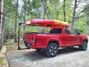 He built an adjustable rack using Unistrut channel that lets kayaks be carried above the bed, leaving the bed fully usable.