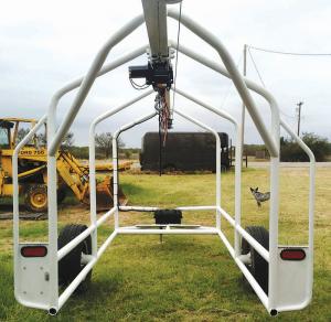 The hoist winch trolley is constructed from 1/2-in. plate steel with 1 3/4-in. dia. cam rollers. The trailer features a sturdy tongue hitch and rides on a pair of wheels from an old wagon. Surber says the gantry works well for safely lifting and hauling different-sized LP tanks and totes with sturdy metal frames.