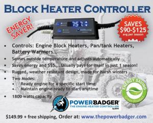 This patented device (called The Power BadgerTM) can also be used to control engine block heaters, pan/tank heaters, battery warmers, livestock water heaters, pipe tape and the like. This device simply plugs in between the wall outlet and your heater. It works by sensing the outside temperature and automatically controlling how/ when the heater is powered. The heater operates just as effectively, yet