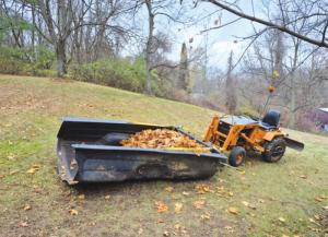 Daugherty says he can push into a large pile of leaves and easily scoop them up, raking them in by hand as needed. When the liner is full, he lifts it and dumps the leaves into a pile. The leaf pan is one of several attachments Daugherty has built for his loader since buying it eight years ago. Others include a snowblower, a dirt blade, and a hydraulic scoop.