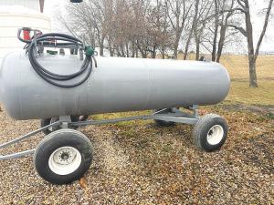 Manuel Sanders says the diesel-fuel trailer he and his dad built from an old 1,000-gal. anhydrous ammonia tender worked well on their farm during spring planting and harvest. Sanders says they paid around $500 several years ago for the old tank and trailer, and another $500 for parts and paint for the conversion, considerably less than buying a factory-built trailer that size.