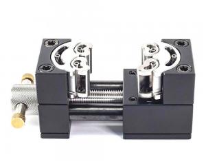 Weighing only 14 oz., the black anodized aluminum model delivers over 3,000 Nm of torque at full clamping force while remaining light enough to move around a workspace. The 20-mm jaw depth and 32-mm clamping zone double the gripping height of standard desktop vises, ensuring stability for projects big and small. Each component is precision-machined from premium metals and hand-finished, promising durability and a sharp look. High-tensile cap head bolts hold the pieces together, allowing each component to move easily along precision-ground rails.
