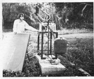 In outward appearance, the solar pump resembles an oversized playground see-saw. A long steel boom swivels on an axle about 42 ft. off the ground. The resultant mechanical energy takes the form of this boom see-sawing about its axle. Rods connect it to the conventional plunger pump in the well - much like a conventional windmill set-up.